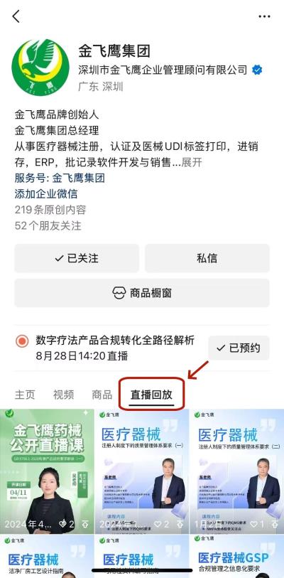 往期直播培訓課程支持回放,關注“金飛鷹藥械谘詢服務”視頻號並點擊視頻號主頁,即可查看“直播回放”哦~