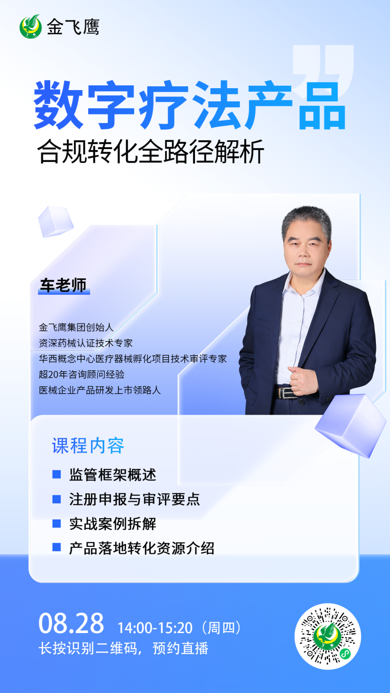 這些關鍵問題正製約著行業的快速發展。在此背景下,由金飛鷹、成都市溫江區永寧街道商會、四川省供貨商商會主辦,成都市技術轉移聯盟、四川大學商學院MEM中心、四川西部醫藥技術轉移中心、成都高新區醫療器械創新轉化協會、成都天府新區地平線探索數據谘詢服務中心、成都長健偉業生物科技有限公司、成都高新區數智醫療創新聯盟會、成都連康投資有限公司協辦的“智造未來·醫鏈共生”——溫江三醫創新中心醫療器械產業生態合作交流會,將於8月28日下午在溫江區科大科創穀三醫創新中心路演廳舉辦。本次峰會由金飛鷹集團創始人車號爽老師主導進行分享,他將結合金飛鷹輔導過的眾多成功案例,深入剖析數字療法產品合規轉化全路徑,為企業提供產品落地轉化的全方位指導,助力企業在數字療法賽道上實現突破性發展!
