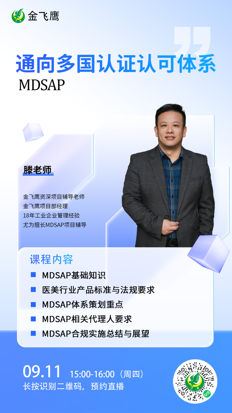 9月11日下午3點,金飛鷹高級項目谘詢師、有著諸多MDSAP項目輔導經驗的滕老師,給大家深入淺出地講解MDSAP審核的核心邏輯與應對技巧,讓您不僅“知其然”,更“知其所以然”!感興趣的朋友記得提前預約,鎖定這場合規必修課!