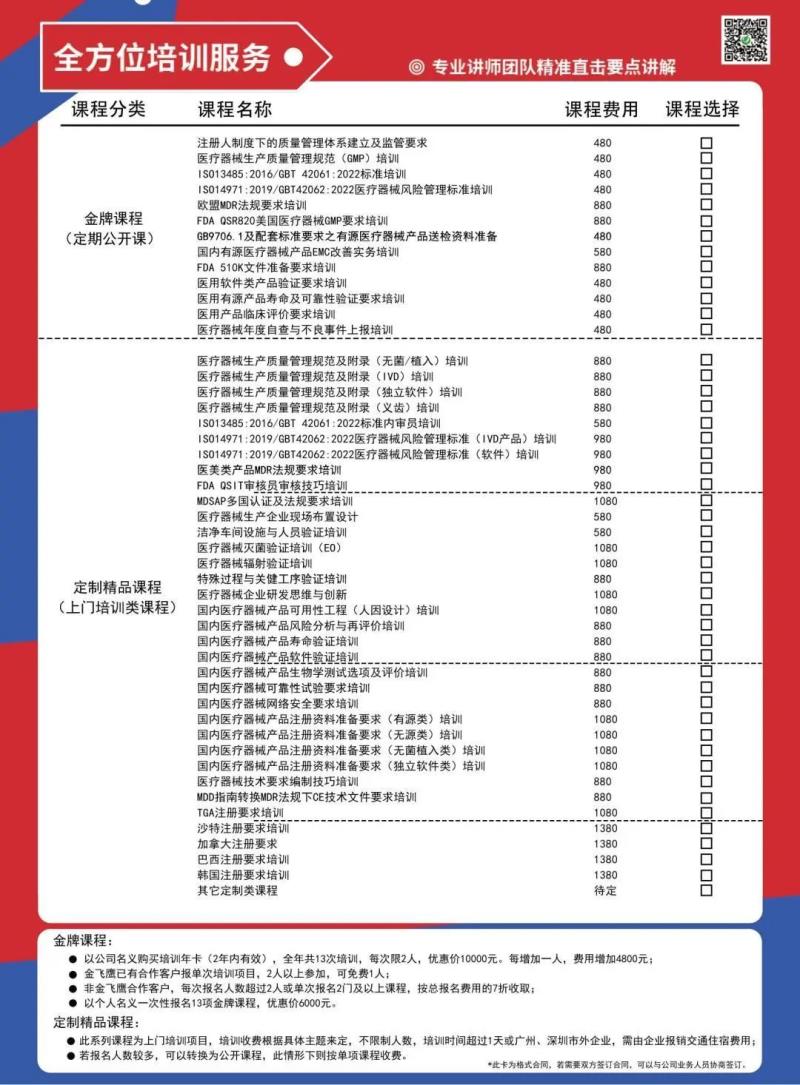 分為定期線下公開課及上門培訓兩種形式,共有13節金牌課程+34節定製精品課程(詳見上方海報),課程主題涵蓋了醫療器械國內外注冊及體係的多個環節、多個領域,優選金飛鷹具備豐富專業知識及實戰經驗的技術及項目老師,為學員提供全方位、高質量的醫療器械注冊指導。