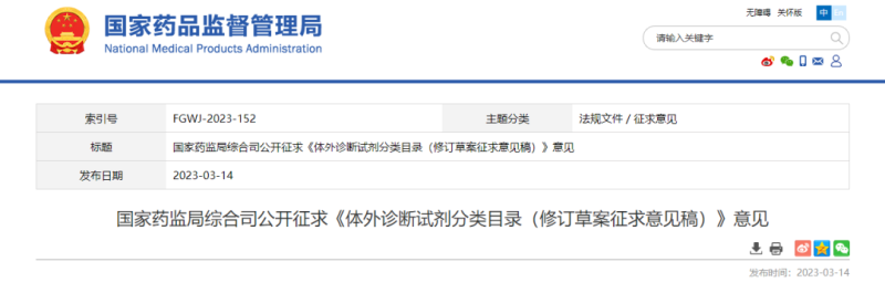 3月14日,國家藥監局官網發布公告稱,為貫徹落實新修訂的《醫療器械監督管理條例》《體外診斷試劑注冊與備案管理辦法》及《體外診斷試劑分類規則》中體外診斷試劑分類管理的要求,夯實體外診斷試劑分類管理基礎,國家藥監局組織開展了《體外診斷試劑分類目錄》修訂工作,形成了《體外診斷試劑分類目錄(修訂草案征求意見稿)》(以下簡稱《征求意見稿》),並向社會公開征求意見。