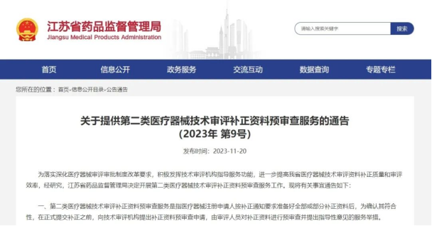 11月20日,江蘇省藥監局官網發布《關於提供第二類醫療器械技術審評補正資料預審查服務的通告(2023年第9號)》,決定開展第二類醫療器械技術審評補正資料預審查服務工作。具體通告內容如下: