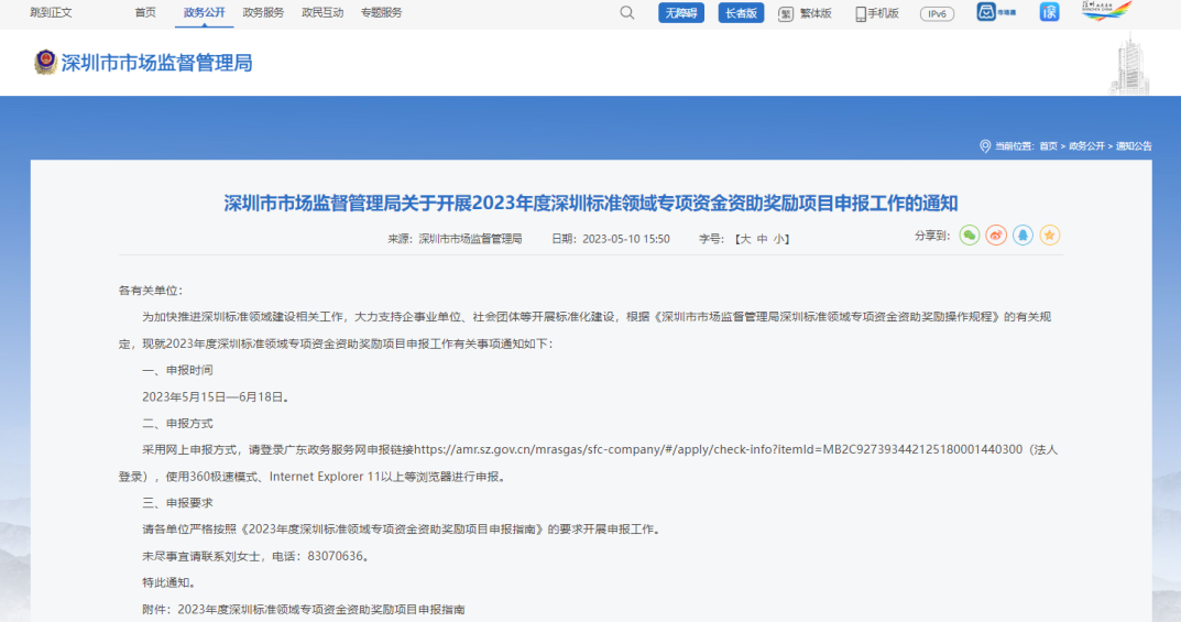 5月10日,深圳市市場監督管理局官網發布《關於開展2023年度深圳標準領域專項資金資助獎勵項目申報工作的通知》(以下簡稱《通知》),公開告知2023年度深圳標準領域專項資金資助獎勵項目申報工作有關事項。