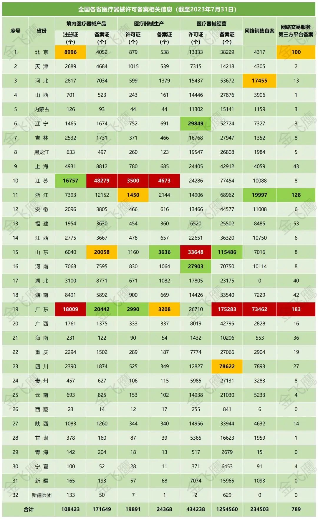 8月7日,國家藥監局公布了截至2023年7月31日各省有效期內醫療器械產品注冊備案、醫療器械生產企業許可備案等信息,老規矩,金飛鷹小編對此稍作編輯,標注紅色、綠色、黃色的分別為前三甲。