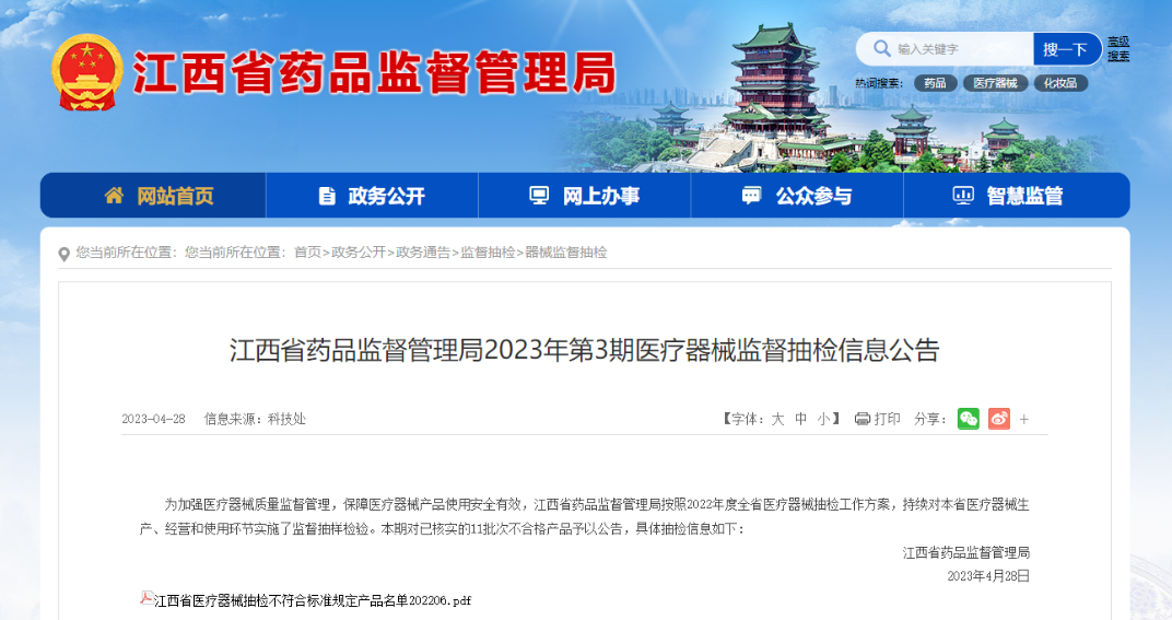 近日,江西省藥品監督管理局發布2023年第3期醫療器械監督抽檢信息公告。此次共檢出11批次不合格產品,涉及:標稱南昌市東海醫療器材有限公司生產的一次性使用醫用口罩、標稱鄭州邁斯通醫療科技有限公司生產的紅外線額溫槍、標稱廣東五連發實業有限公司生產的醫用紅外額溫計等產品,具體如下:
