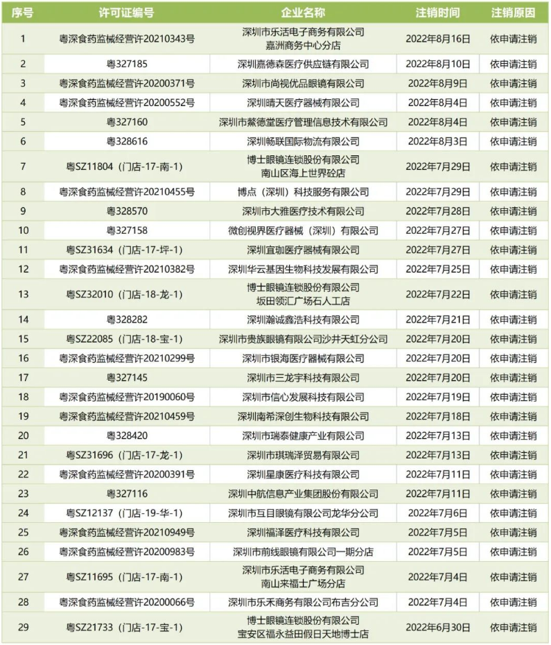 9月14日,深圳市市場監督管理局發布2022年第1期注銷醫療器械經營許可證(第三類醫療器械)的通告,宣布注銷87個醫療器械許可證,以下為詳細清單: