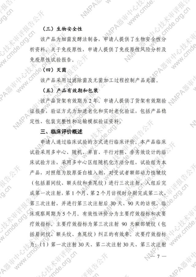 近日,國家藥監局器審中心公開了創新醫療器械“注射用重組Ⅲ型人源化膠原蛋白溶液”的審評報告,我們將其以圖片形式轉載如下: