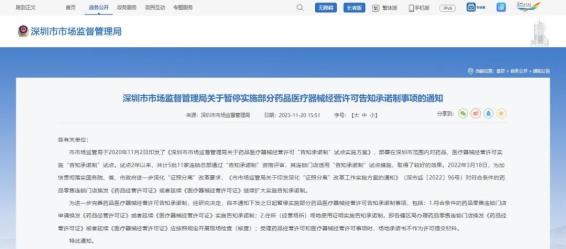 近日,深圳市市場監督管理局官網發布《關於暫停實施部分藥品醫療器械經營許可告知承諾製事項的通知》,其中指出,自該通知下發之日起暫停實施部分藥品醫療器械經營許可告知承諾製事項,包括: