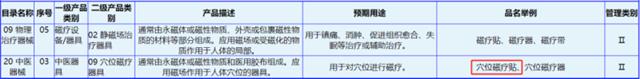 穴位磁療貼屬於磁療產品這個大類,它是指利用磁場的物理性能治療或緩解人體疾病的醫療器械。雖然磁療也是物理治療方式的一種,但因為本期取證產品名稱有一個前綴“穴位”,便被劃分到了“中醫器械”範疇,分類編碼20-03-09(未被應用在穴位的磁療貼分類編碼則為09-05-02)。