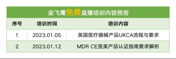 近期是新冠病毒感染高發期,我們不難發現,身邊感染新冠的人越來越多了,金飛鷹團隊也不例外,這給我們工作的正常開展帶來了一定阻力。因此,原定於2022年12月29日的培訓《歐盟MDR CE醫美產品認證指南要求解析》將延期至2023年1月12日,《英國醫療器械產品UKCA流程與要求》培訓時間不變,仍在2023年1月5日,具體如下:
