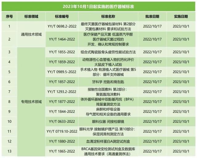 今天是10月1日,那麼借此機會我們就將2023年10月1日起實施的13項醫療器械標準彙總到一起(包括2項通用技術領域標準及11項專業技術領域標準小編辛苦整理,覺得有用別忘點讚+在看+轉發鼓勵一下哦~圖片
