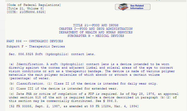 隱形眼鏡護理液在FDA同樣被劃分為第二類醫療器械監管(在我國則是第三類醫療器械),法規編號為21CFR886.5928,產品代碼是LPN(此前也有部分此類產品代碼為LYL):
