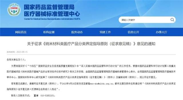 近日,國家藥監局醫療器械標準管理中心官網發布《納米材料醫療產品分類界定指導原則(征求意見稿)》,具體內容如下: