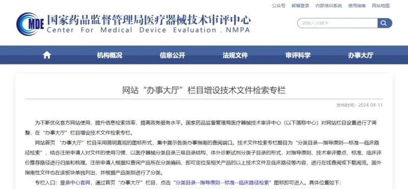 4月11日,國家藥監局器審中心發布公告稱,對網站欄目設置進行了調整,在“辦事大廳”欄目增設技術文件檢索專欄。