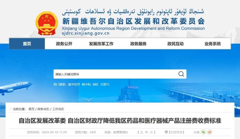 4月18日,新疆維吾爾自治區發展和改革委員會同自治區財政廳印發《關於調整藥品醫療器械產品注冊費收費標準的通知》,明確自2024年4月29日起,取消藥品補充申請注冊費,藥品再注冊費由22284元/次降為1200元/次,境內第二類醫療器械產品首次注冊費由70434元/次降為2800元/次、變更注冊費由29484元/次降為2400元/次、延續注冊費由29250元/次降為1200元/次。同時,按照國家要求,對與新型冠狀病毒防控相關的藥品和醫療器械產品免征注冊費,執行期限延長至2027年12月31日。
