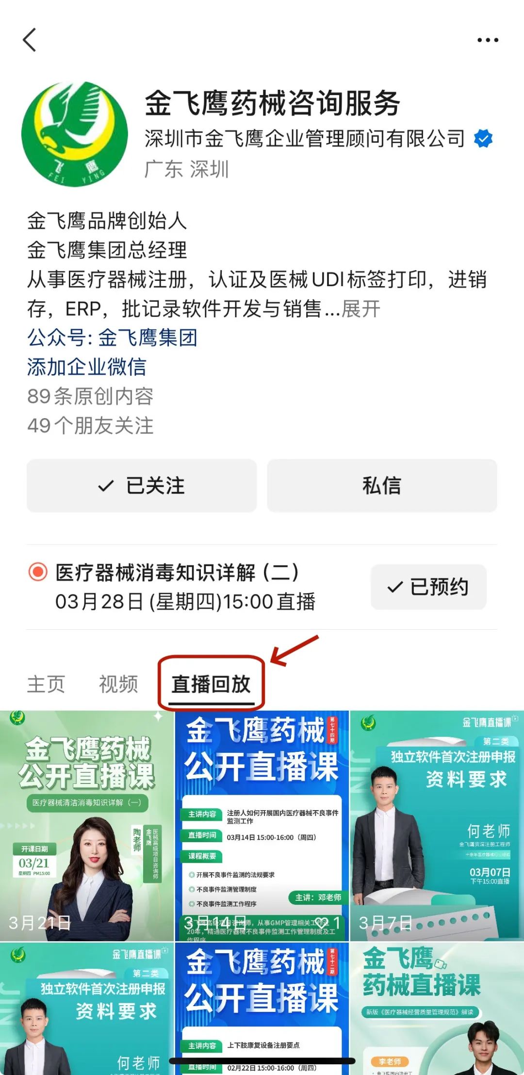 劃重點往期直播培訓課程支持回放,關注“金飛鷹藥械谘詢服務”視頻號並點擊視頻號主頁,即可查看“直播回放”哦~
