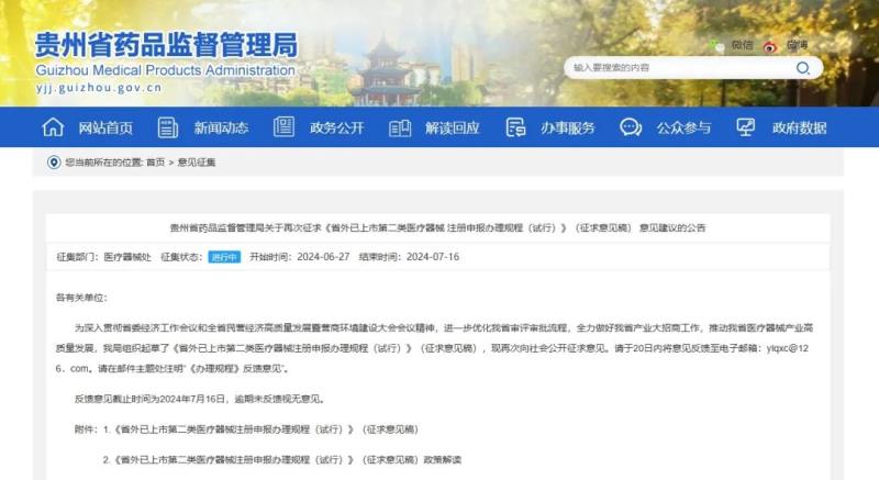 6月27日,貴州省藥監局發布《關於再次征求〈《省外已上市第二類醫療器械 注冊申報辦理規程(試行)〉(征求意見稿) 意見建議的公告》,其中提到,該局組織起草了《省外已上市第二類醫療器械注冊申報辦理規程(試行)》(征求意見稿)(以下簡稱《辦理規程》),現再次向社會公開征求意見。