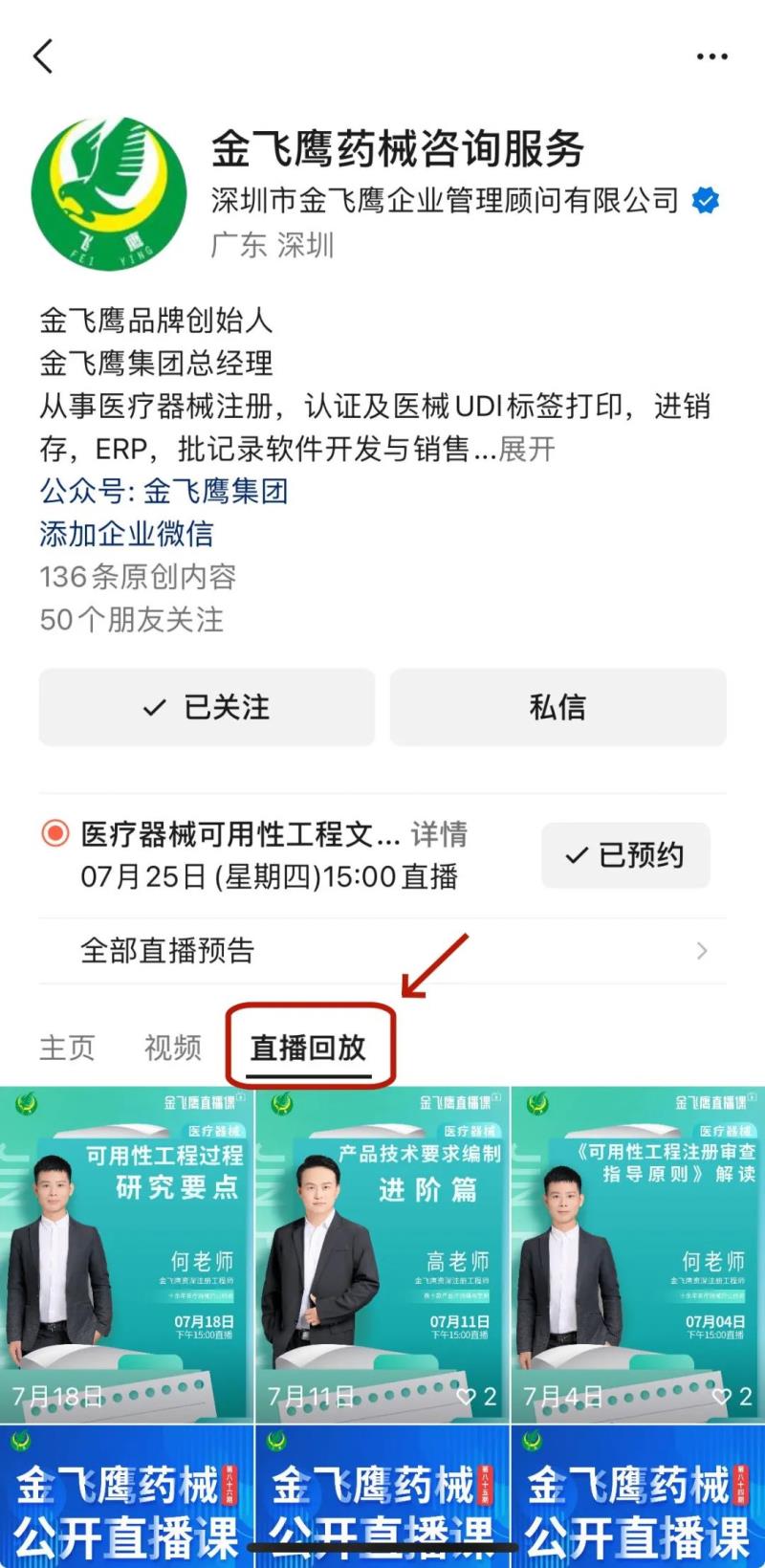 往期直播培訓課程支持回放,關注“金飛鷹藥械谘詢服務”視頻號並點擊視頻號主頁,即可查看“直播回放”哦~
