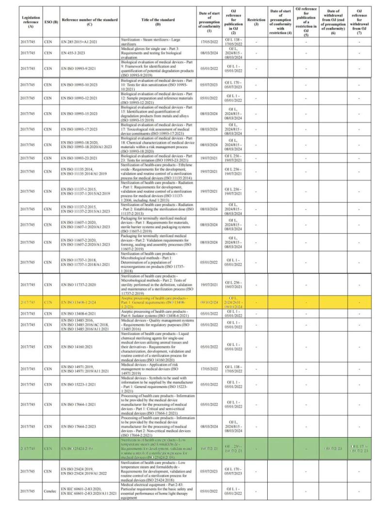 截至目前,歐盟MDR協調標準清單共計26項協調標準,具體見下方圖片(其中標黃的為本次更新標準,標綠的則為已經撤銷的標準):