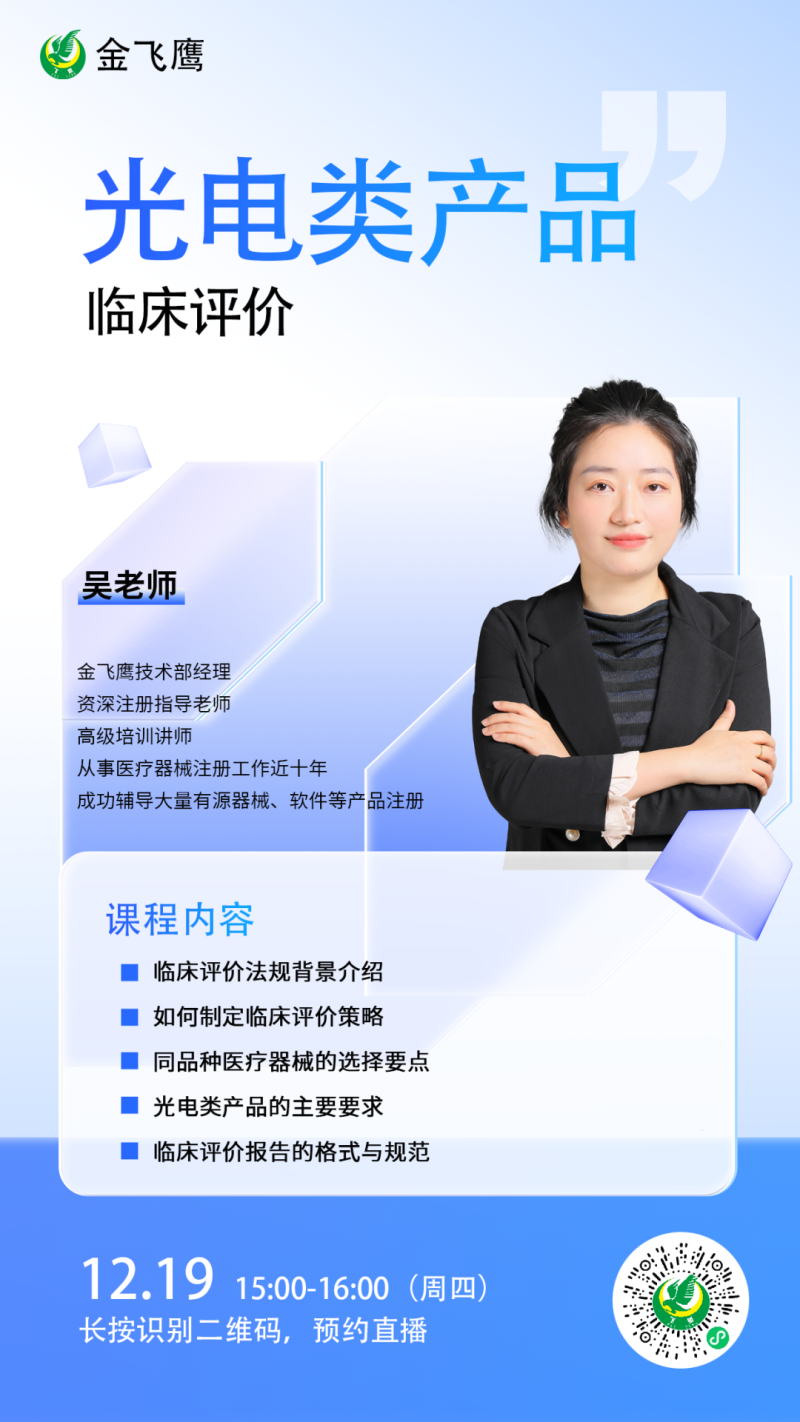 金飛鷹直播培訓簡介 金飛鷹直播培訓,是每周一次的固定培訓欄目,優選金飛鷹國內外資深注冊/項目老師定期為大家講解醫療器械注冊相關知識,解答大家在醫療器械注冊過程中的諸多疑問。 此前我們已為大家帶來新版醫療器械生物學評價標準、新版醫療器械風險管理標準、醫療器械軟件注冊、醫療器械質量管理體係提升技巧等共計107次線上培訓課程,有興趣的可點擊視頻號直播回放進行查看~另外大家也一定很關注接下來的培訓主題,相關培訓預告我們會陸續添加至視頻號,請大家持續關注哦!