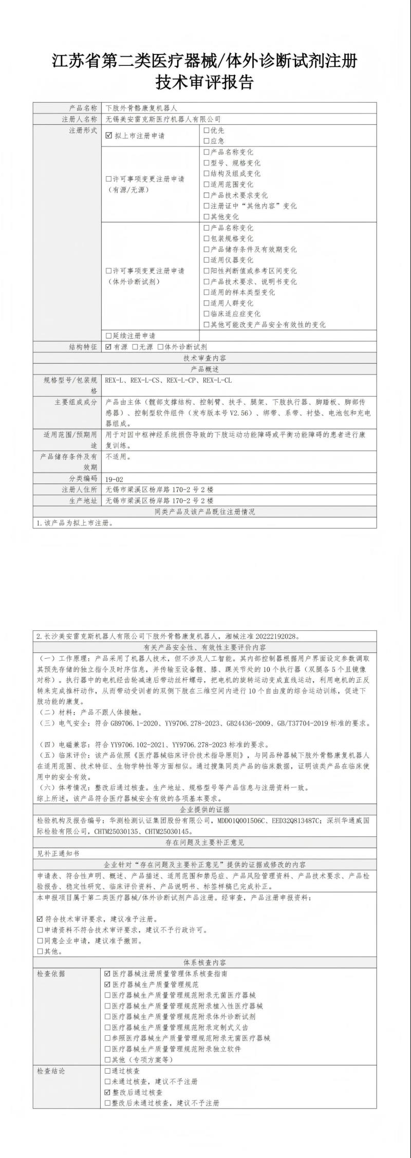 近日,江蘇省藥監局公布了2025年5月批準注冊的磁刺激治療儀、重組膠原蛋白液體敷料、生命體征檢測儀、一次性使用無菌皮膚滾針、短波治療儀、艾灸儀、醫用透明質酸鈉凝膠敷料、下肢外骨骼康複機器人等164個醫療器械產品目錄,同時隨附了所有產品的技術審評報告,我們其中“下肢外骨骼康複機器人”(預期用途:用於對因中樞神經係統損傷導致的下肢運動功能障礙或平衡功能障礙的患者進行康複訓練)的技術審評報告以圖片形式轉載如下: