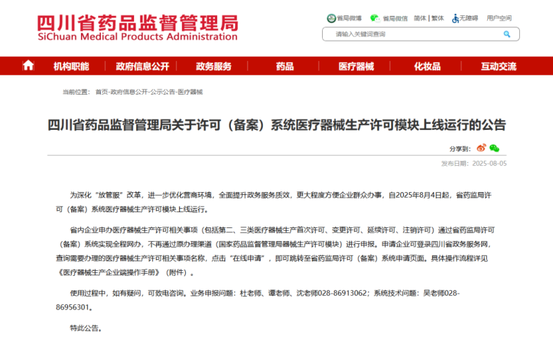 8月4日,四川省藥監局發布《關於許可(備案)係統醫療器械生產許可模塊上線運行的公告》(以下簡稱《公告》),其中提到,自2025年8月4日起,省藥監局許可(備案)係統醫療器械生產許可模塊上線運行。