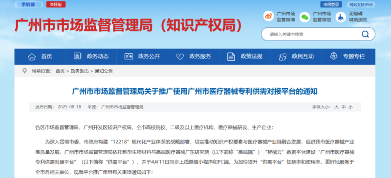 8月18日,廣州市市場監督管理局發布《關於推廣使用廣州市醫療器械專利供需對接平台的通知》(以下簡稱《通知》),《通知》提到,該局依托新型生物材料與高端醫療器械廣東研究院(以下簡稱“高端院”)“智械雲”數據平台建設“廣州市醫療器械專利供需對接平台”(以下簡稱“供需平台”),並於4月11日同步上線微信小程序和PC端。現就平台推廣使用有關事項通知如下: