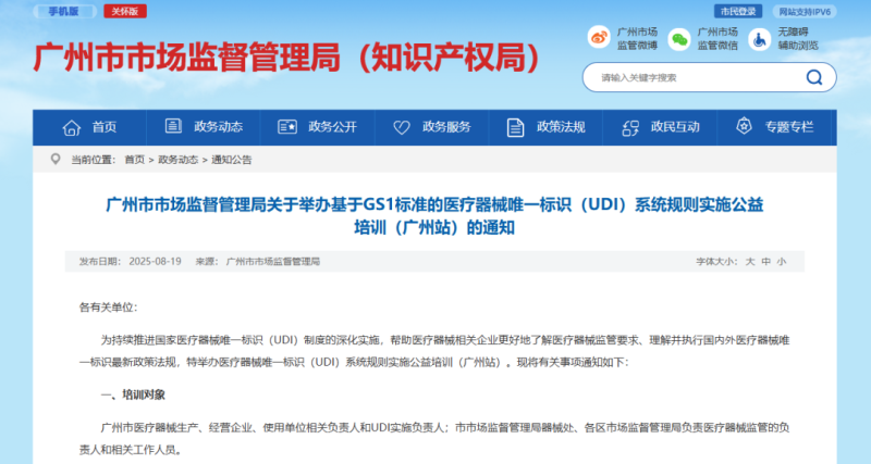 8月19日,廣州市市場監督管理局發布《關於舉辦基於GS1標準的醫療器械唯一標識(UDI)係統規則實施公益培訓(廣州站)的通知》,該培訓由廣州市市場監督管理局、中國物品編碼中心主辦,廣州市標準化研究院(中國物品編碼中心廣州分中心)承辦,誠邀廣州市醫療器械生產、經營企業、使用單位相關負責人和UDI實施負責人報名參加。培訓內容及報名方式如下: