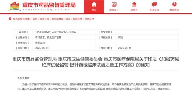 8月11日,重慶市藥品監督管理局、重慶市衛生健康委員會、重慶市醫療保障局三部門聯合發布《加強藥械臨床試驗監管 提升藥械臨床試驗質量工作方案》(以下簡稱《工作方案》),以進一步加強重慶市臨床研究體係和能力建設,提升藥械臨床試驗支撐能力和試驗質量,助力重慶生物醫藥產業高質量發展。