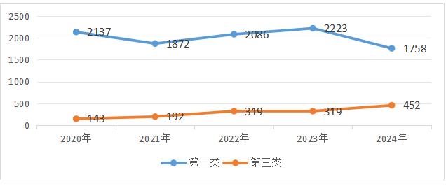2024年,省藥監局依職責受理第二類醫療器械首次注冊、延續注冊、變更注冊和變更備案申請共計9208項,與2023年相比增加2.5%。近五年廣東省受理第二類醫療器械注冊情況見圖5。