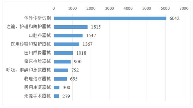 按醫療器械產品分類目錄統計,首次注冊獲批數量排名前十位的品種分別是:體外診斷試劑,神經和心血管手術器械,注輸、護理和防護器械,口腔科器械,醫用成像器械,無源植入器械,有源手術器械,呼吸、麻醉和急救器械,醫用診察和監護器械、輸血、透析和體外循環器械。其中,前五品種注冊證合計298個,占比65.9%;前十品種注冊證合計410個,占比90.7%。
