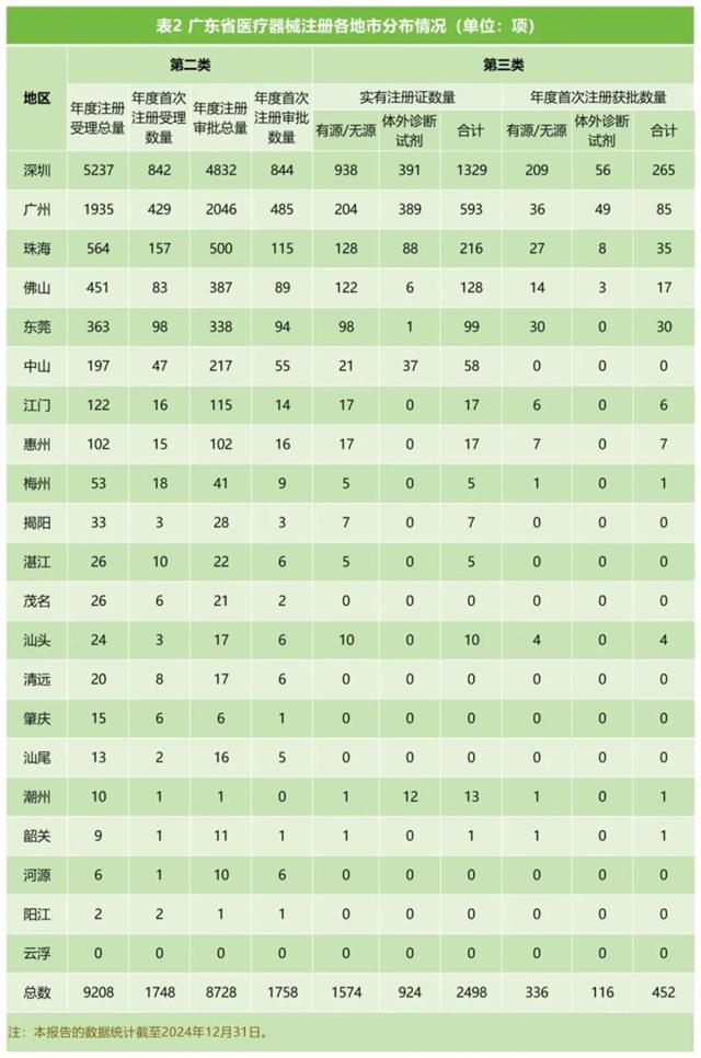 2024年,廣東省各地市第二類醫療器械注冊受理和審批分布情況、第二類醫療器械首次注冊受理和審批分布情況、第三類醫療器械首次注冊獲批情況及截至2024年底各地市實有第三類醫療器械注冊證情況見表2。