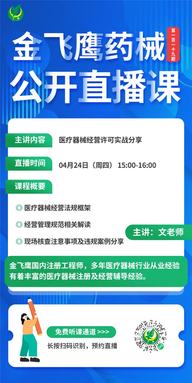 4月24日下午3點,金飛鷹國內注冊工程師、有著豐富醫療器械注冊及經驗輔導經驗的文老師給大家帶來《醫療器械經營許可實戰經驗分享》,培訓內容包括醫療器械經營法規框架、經營管理規範相關解讀、現場核查注意事項及違規案例分享,結合他本身積累的豐富經營許可辦理經驗,從理論解讀到實操指導,全方位剖析醫療器械經營許可的申報要點與技巧。