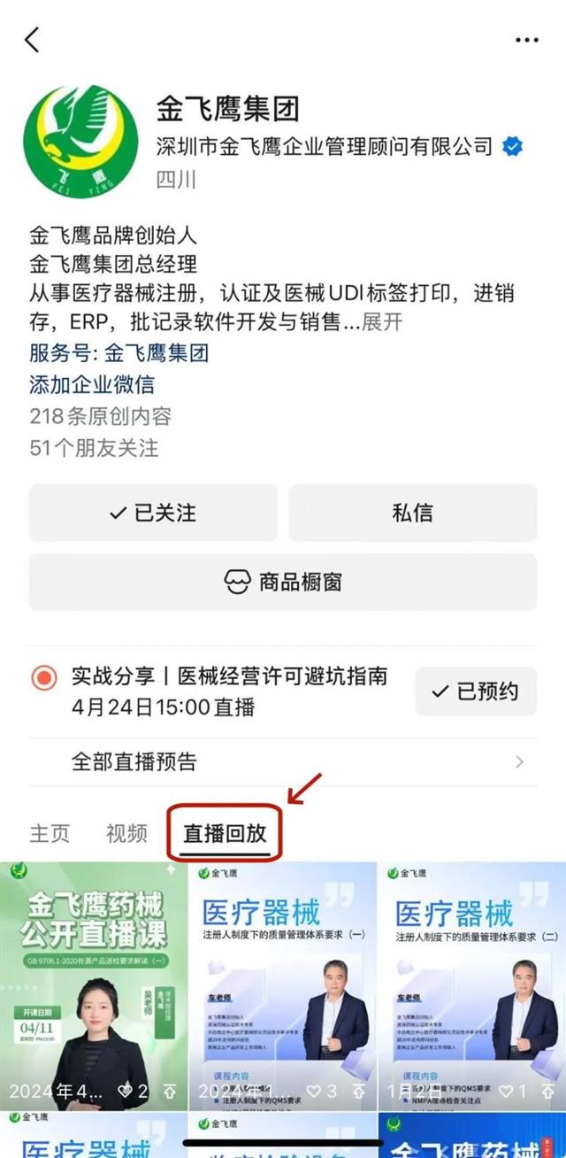金飛鷹直播培訓簡介 金飛鷹直播培訓,是每周一次的固定培訓欄目,優選金飛鷹國內外資深注冊/項目老師定期為大家講解醫療器械注冊相關知識,解答大家在醫療器械注冊過程中的諸多疑問。 此前我們已為大家帶來新版醫療器械生物學評價標準、新版醫療器械風險管理標準、醫療器械軟件注冊、醫療器械質量管理體係提升技巧等共計118次線上培訓課程,有興趣的可點擊視頻號直播回放進行查看~另外大家也一定很關注接下來的培訓主題,相關培訓預告我們會陸續添加至視頻號,請大家持續關注哦! 往期直播培訓課程支持回放,關注“金飛鷹藥械谘詢服務”視頻號並點擊視頻號主頁,即可查看“直播回放”哦~