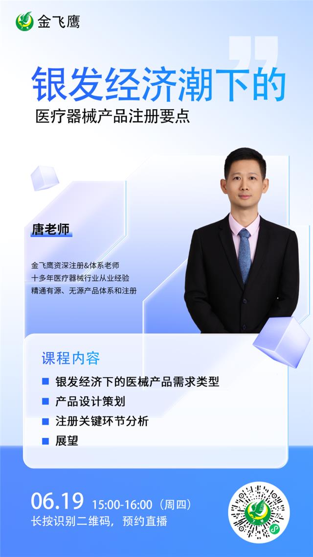 的唐老師給大家帶來《銀發經濟浪潮下的醫療器械注冊要點》,感興趣的朋友記得提前預約,與我們一起解鎖“銀發經濟”產品注冊全流程優化方案~