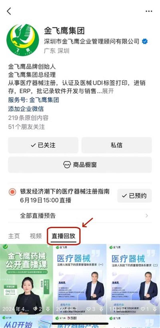 往期直播培訓課程支持回放,關注“金飛鷹藥械谘詢服務”視頻號並點擊視頻號主頁,即可查看“直播回放”哦~