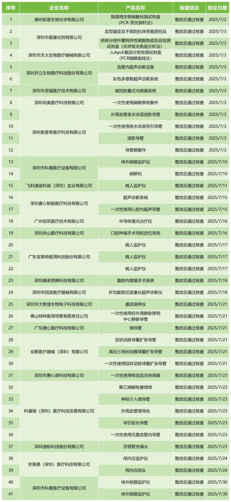 近日,廣東省藥監局官網公布2025年7月醫療器械注冊質量管理體係核查結果,包括深圳市科曼醫療設備有限公司的體外除顫監護儀、廣州信築醫療技術有限公司的半導體激光治療儀、廣東寶萊特醫用科技股份有限公司的病人監護儀、業聚醫療器械(深圳)有限公司的冠狀動脈球囊擴張導管、科睿馳(深圳)醫療科技發展有限公司的一次性使用無菌血管內導管等共計41款產品,均為“整改後通過核查”。具體明細見下方表格: