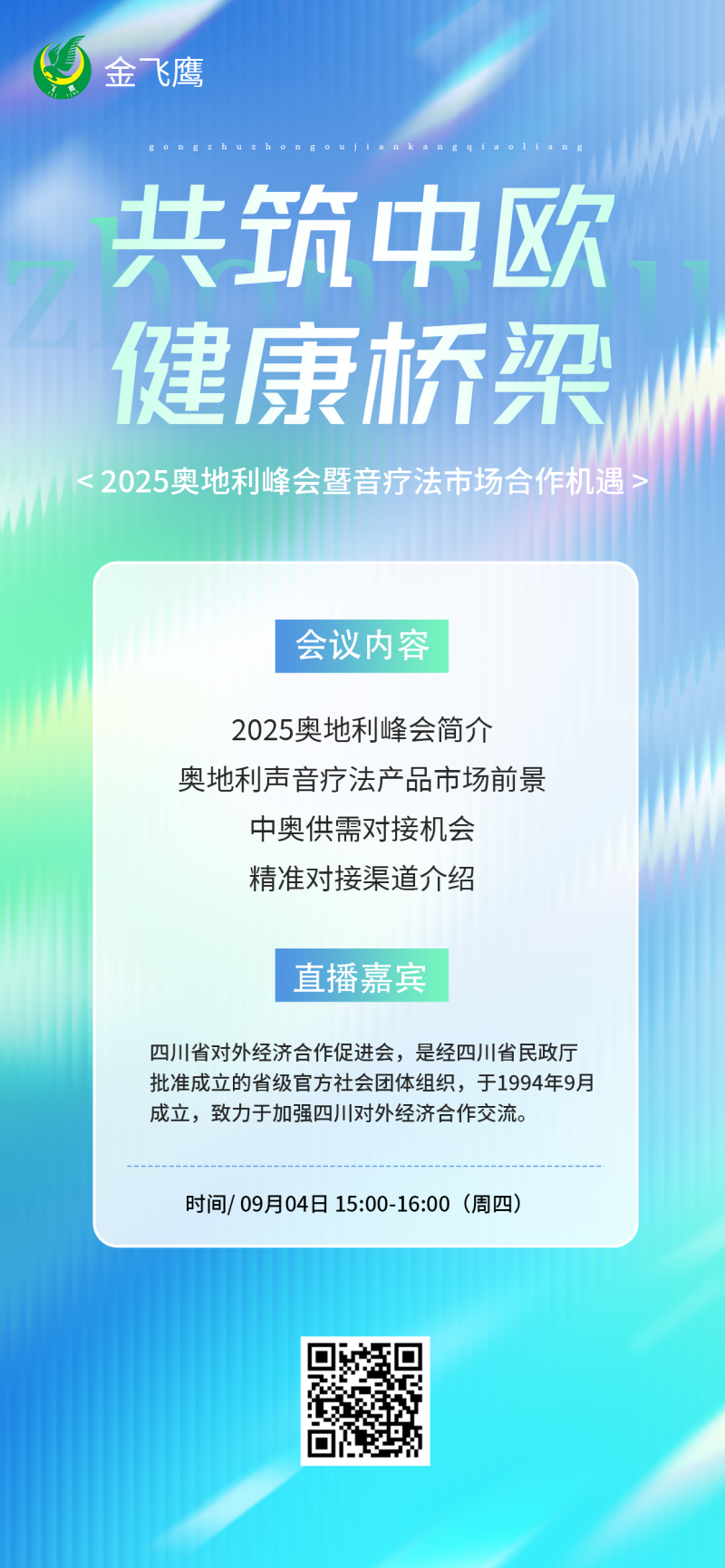 在此背景下,9月4日下午3點,我們特別聯合四川省對外經濟合作促進會,給大家帶來第十一屆“全球經濟發展論壇·奧地利峰會”暨音療法市場合作機遇的直播,為您解鎖奧地利市場的財富密碼!本期直播將從奧地利音療法產品市場前景、中奧供需對接機會及渠道等方麵進行分享,與各位共拓奧地利的掘金版圖,感興趣的朋友記得提前預約!