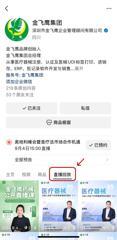 往期直播培訓課程支持回放,關注“金飛鷹藥械谘詢服務”視頻號並點擊視頻號主頁,即可查看“直播回放”哦~
