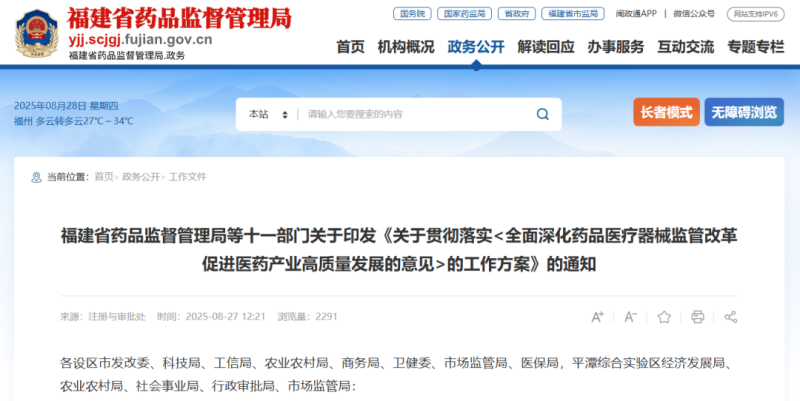 近日,福建省藥監局發布《關於貫徹落實<全麵深化藥品醫療器械監管改革促進醫藥產業高質量發展的意見>的工作方案》(以下簡稱《工作方案》),從大力支持藥械研發創新、提高藥械審評審批質效、提升醫藥產業全過程合規水平、擴大醫藥產業對外開放合作、強化產業發展和監管體係保障五個方麵共提出了24條舉措,並提到,力爭到