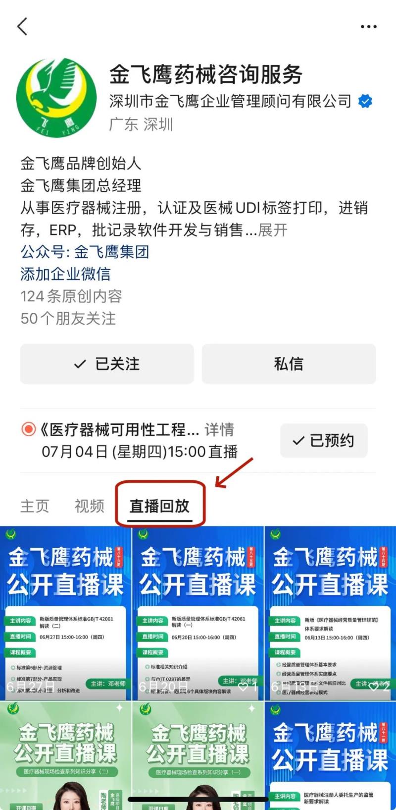 往期直播培訓課程支持回放,關注“金飛鷹藥械谘詢服務”視頻號並點擊視頻號主頁,即可查看“直播回放”哦~