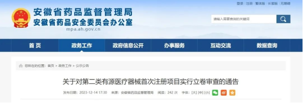 近日,安徽省藥監局發布通告稱,自2024年1月1日起,對安徽省第二類有源醫療器械首次注冊項目實行立卷審查工作,有關事項具體如下: