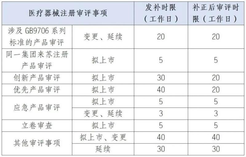 近年來,全國多個省份都發布了相關文件,對縮減醫療器械審評時限、加快審評速度提出了具體要求。近日,江蘇省藥監局審評中心印發《關於嚴格落實第二類醫療器械注冊技術審評辦理時限要求的通知》文件,對醫療器械注冊審評相關時限進行明確。具體審評辦理時限如下: