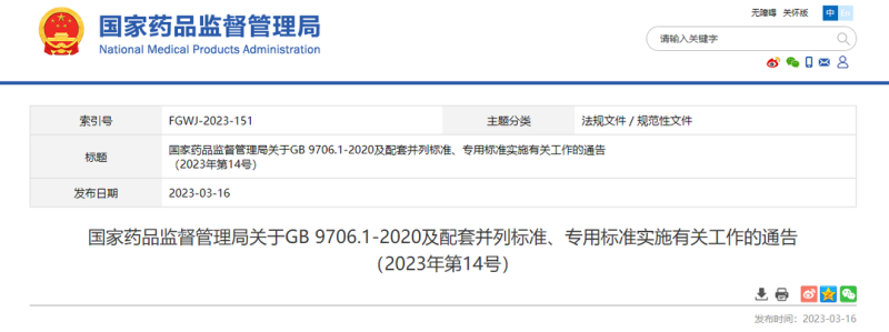 3月16日,國家藥監局官網發布《關於GB 9706.1-2020及配套並列標準、專用標準實施有關工作的通告(2023年第14號)》(以下簡稱《通告》),對注冊備案及檢驗時【相關標準執行要求】明確如下:
