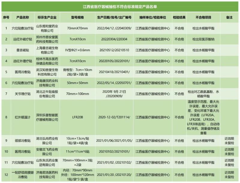 近日,江西省藥品監管局發布2023年第2期醫療器械監督抽檢信息公告。此次共檢出12批次不合格產品,涉及:標稱深圳樂普智能醫療器械有限公司生產的紅外額溫計(LFR20B)、標稱山東煜和堂藥業有限公司生產的穴位貼敷治療貼、標稱鄭州市慈安堂醫藥科技有限公司生產的遠紅外磁療貼等產品,具體如下: