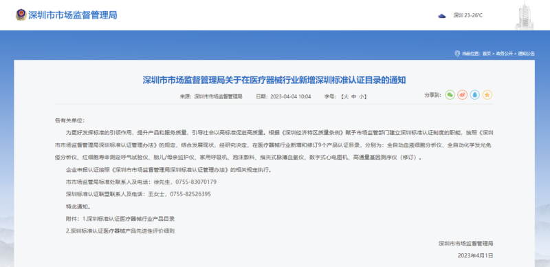 4月4日,深圳市市場監督管理局官網發布《關於在醫療器械行業新增深圳標準認證目錄的通知》(以下簡稱《通知》)。《通知》指出,在醫療器械行業新增和修訂9個產品認證目錄,分別為:全自動血液細胞分析儀、全自動化學發光免疫分析儀、紅細胞壽命測定呼氣試驗儀、胎兒/母親監護儀、家用呼吸機、泡沫敷料、指夾式脈搏血氧儀、數字式心電圖機、高通量基因測序儀(修訂)。《通知》中提到的有關先進性評價細則等附件,大家可點擊文末“閱讀原文”查看。