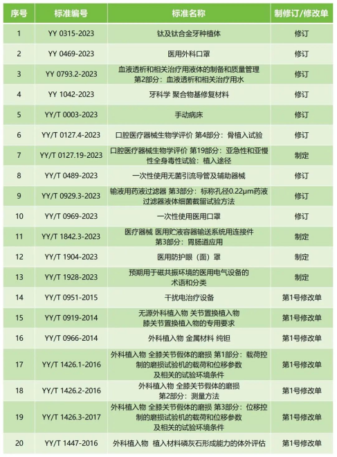 11月24日,國家藥監局發布YY 0315-2023《鈦及鈦合金牙種植體》、YY 0469-2023《醫用外科口罩》等13項醫療器械行業標準(最早自2024年12月1日起實施)及7項醫療器械行業標準修改單,具體如下: