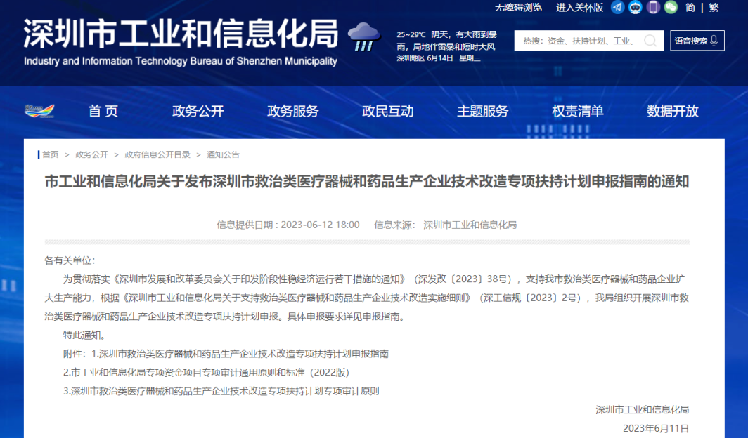 1. 登錄廣東政務服務網——深圳市——市工業和信息化局——搜索申報事項名稱“企業技術改造項目扶持計劃”,選擇“救治類醫療器械和藥品生產企業技術改造專項扶持計劃”事項辦理申請。