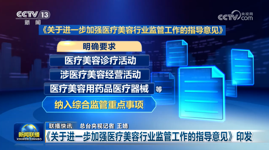 5月4日晚,《新聞聯播》報道了一則有關醫美行業監管的新聞,報道指出,國家市場監督管理總局等11部門於近日聯合印發《關於進一步加強醫療美容行業監管工作的指導意見》(以下簡稱《指導意見》),著重強調跨部門綜合監管,明確要求將醫療美容診療活動、涉醫療美容經營活動以及醫療美容用藥品醫療器械等納入綜合監管重點事項,掃清“黑機構”、“黑醫生”、“黑藥械”,對行業亂象保持高壓嚴打態勢。