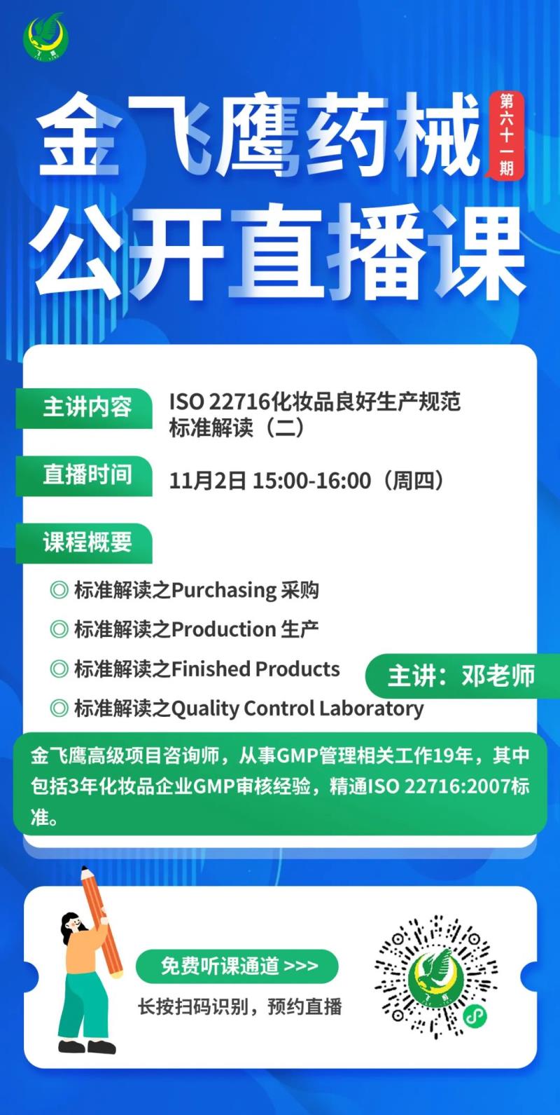 11月2日下午3點,金飛鷹高級項目谘詢師,從事GMP管理相關工作19年,其中包括3年化妝品企業GMP審核經驗的鄧老師,給大家帶來《ISO 22716化妝品良好生產規範標準解讀(二)》,繼續給大家詳細解讀標準的采購、生產、成品、外包、投訴和召回等版塊,大家千萬不要錯過了哦!